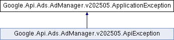 Inheritance diagram for Google.Api.Ads.AdManager.v202505.ApplicationException: